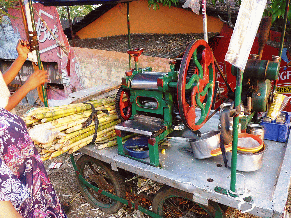 А этот жуткий агрегат-всего лишь соковыжималка ! Она со страшным скрежетом,искря и пыхтя,жмёт сок из тростника,и Вы вкушаете очень вкусный напиток!