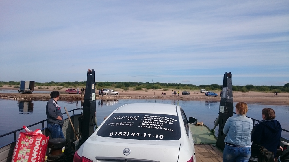 Через Мезень проложен понтонный мост,но из за большого количества осадков,река вышла из берегов и смыла часть моста.Поэтому каждый час курсируют два парома через реку.