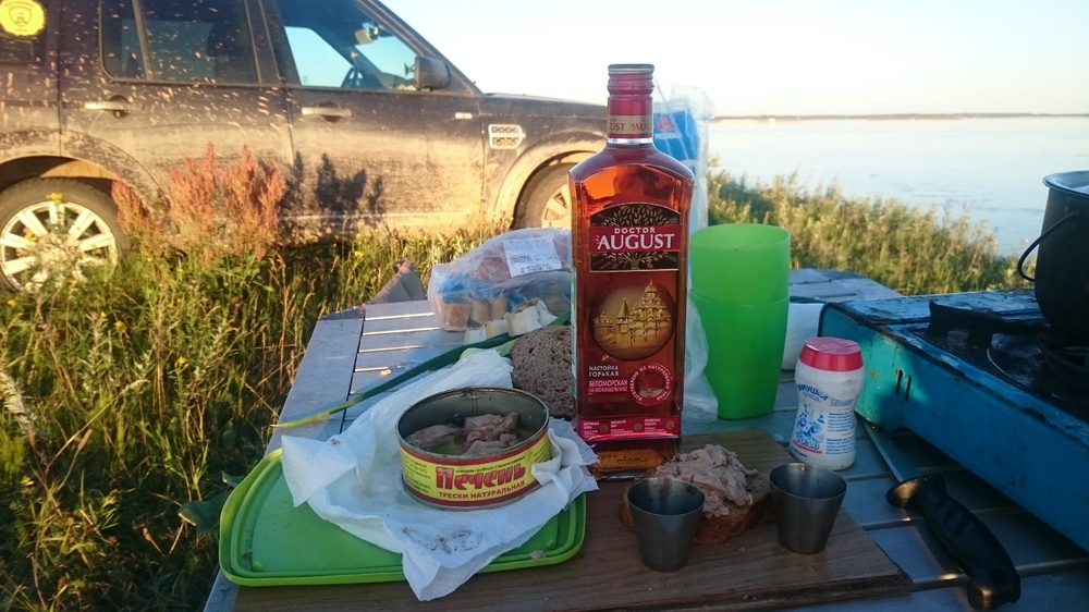 Ну а вечером мы конечно не могли не отметить,что прошли до крайней точки маршрута,вкуснейшая печень трески,да с поморской настойкой!!!
