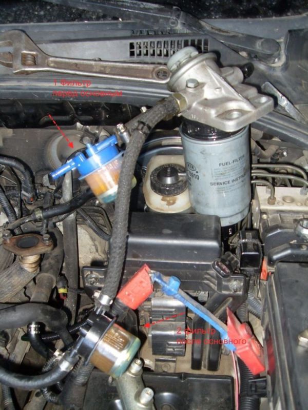 У меня здесь малость под разобрано, но думаю будет понятно. 1 фильтрик стоит перед основным, а 2ой фильтрик стоит после основного (всё это считается по ходу движения саляры.