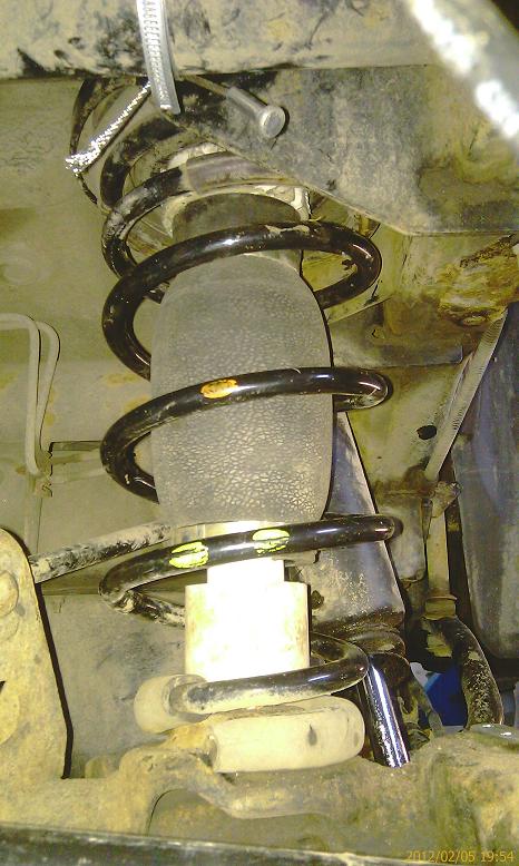 Верхняя часть проставки хорошо села в отверстие верхнего упора пружины. Нижняя часть проставки также подошла по диаметру низа пружины . Чтобы не гуляла нижняя проставка, был установлен кусочек трубы 30-50мм и закреплен болтом на нижней площадке упора пружины на мосту. Все проставки были прикрчены и приклеены к корпусу баллона на болты.