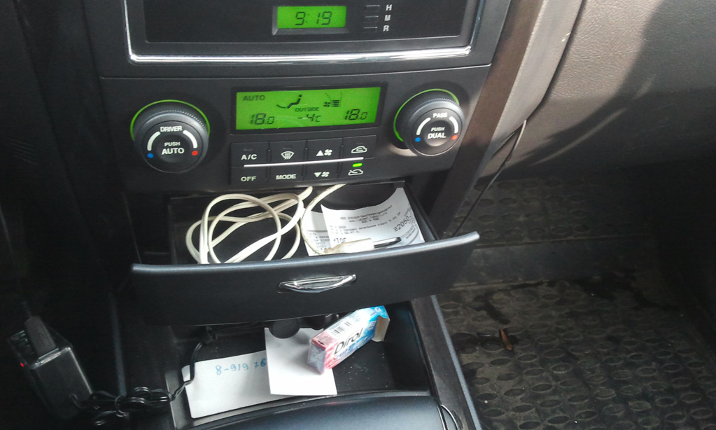 В бардачок не захотел выводить, так как провод AUX хотел наблюдать рядом, что бы подключать мобилу и прочее. Решение было принято выводить в ящичек над пепельницей. Выкрутил 4 винта верхней внутренней части ящичка, отогнул немного крышку (не хотел вытаскивать ящик) и в закрытом состоянии ящичка протолкнул провода. Отмерил нужное количество провода (что бы до держателя мобилы под стеклом хватило) и завинтил ящик обратно. Открывается ящик так же как и раньше, проблем нет. :Yahoo!: