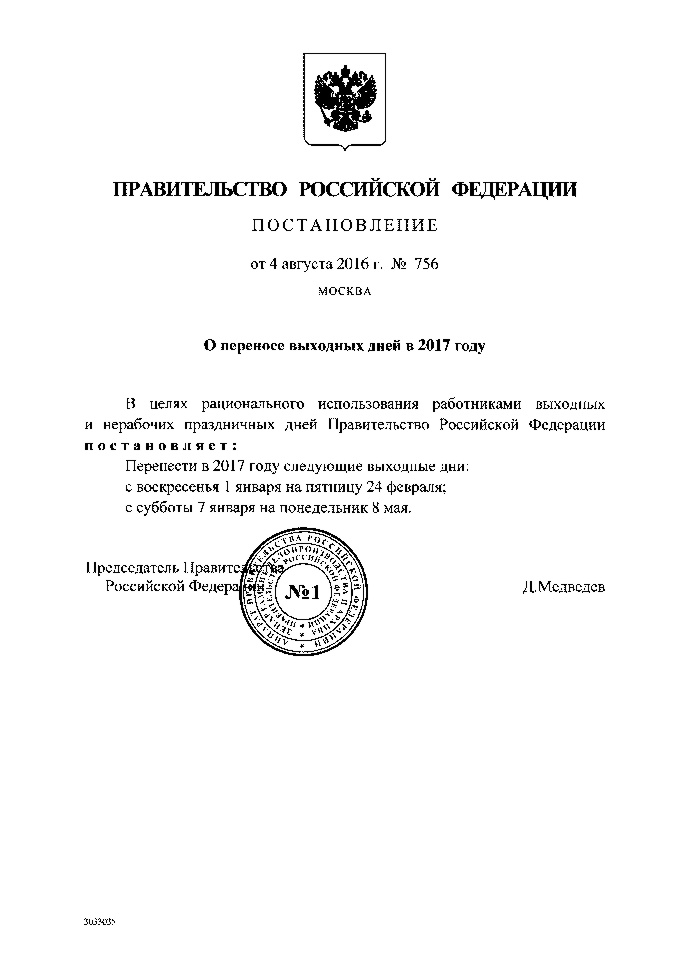"Дмитрий Медведев подписал постановление о переносе выходных дней в 2017 году. Документ опубликован в субботу, 6 августа, на портале правовой информации. Выходные 1 и 7 января (воскресенье и суббота) будут передвинуты на 24 февраля (пятница) и 8 мая (понедельник)."