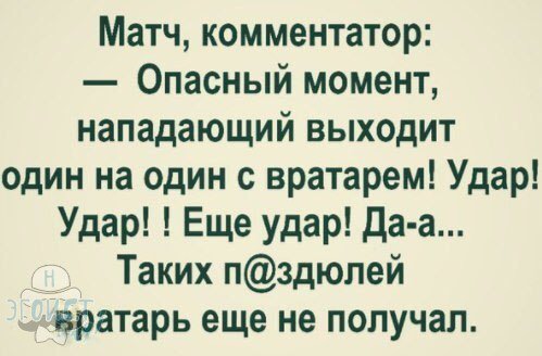 Bот, например, сидит мужик и смотрит футбол, а жена рядом сидит и говорит: "Сделай потише, голова болит, фу, опять этот футбол, тебе только бы телевизор смотреть, я и дети тебе пофиг, говорила мне мама, выходи за летчика, их дома никогда нет и зарабатывают много, а ты вообще ни хрена не зарабатываешь!".