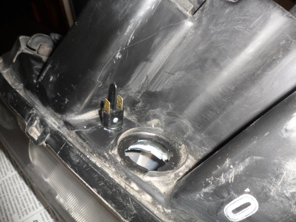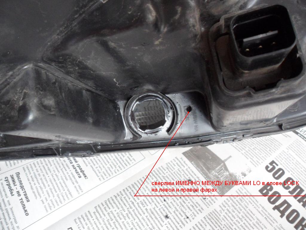 Снимаем фары, вынимаем ВСЕ лампочки, берем дрель с сверлом от 3 до 6 мм и сверлим корпус и отражатель строго между буквами LO слова LOCK на корпусе фары рядом с штатным отверстием для габарита+поворотника.