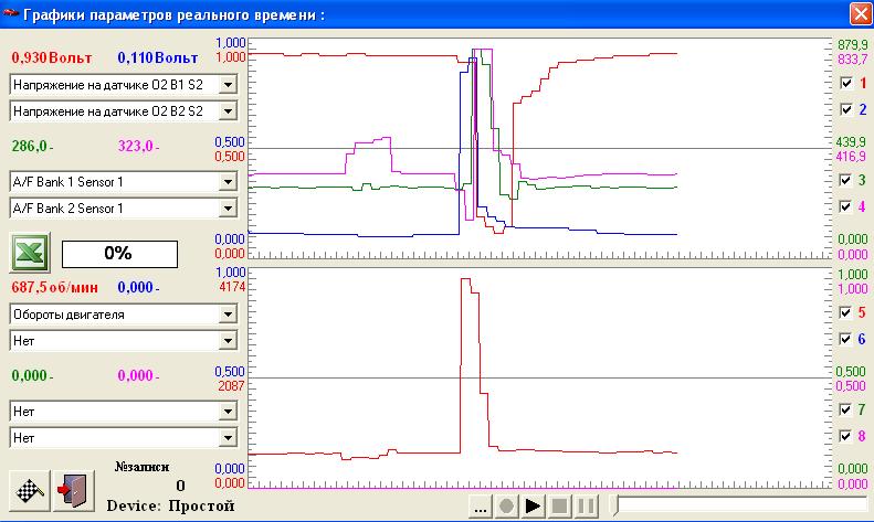 Движок 6-ти цилиндровый, V-образный. На каждой половинке свой катализатор. До него стоят A/F сенсоры. Для смеси с лямбда = 1, они должны показывать 1.5 В. Ниже - богатая смесь, выше - бедная. После катализатора обычный датчик кислорода. Для смеси с лямбда = 1, они должны показывать 0.5 В. Ниже - бедная смесь, выше - богатая. Таким образом, всего имеем 4 датчика, 2 таких, 2 таких. Есть еще 3-й катализатор на общей требе, после слияния двух половинок. На нем датчиков нет.