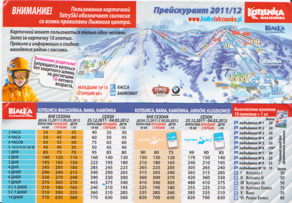 Корнеты можно брать на время, а можно и на количество подъемов, если много народу, то лучше на количество подъемов (время не ограничено, и при неиспользовании деньги вернут при сдаче карты) . 30 злотых - 6 подъемов на медленном и 4 на быстром, в самую верхнюю точку. По бокам Бялки есть ответвления с красными горками, там тоже подъемники. По дороге туда попадаются и черные горки, кому надо.