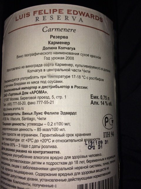 Лёша, сейчас взял в К&Б на выбор три бутылочки класса Reserva ценой не более 500р. Годы урожая: 2008 и две 2010. Годы розлива в бутылки определил только на той, что 2008 урожая: 11.2009, на двух других сверху наклейка с переводом, отдирать не хотелось. Думаю, что конец 2011-начало 2012.