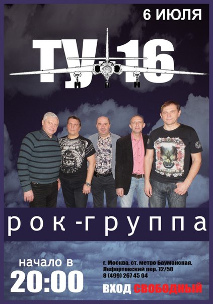 3 мая состоится очередной концерт группы ТУ-16 в клубе Швайн, Лефортовский переулок 12. Начало в 20.00. Вход свободный. м.Бауманская, от метро недалеко, в клубе пиво и др.более крепкие напитки. Группа существует с 1978 года. Приглашаю всех одноклубников и их друзей. Я участник и руководитель группы, автор всех композиций.