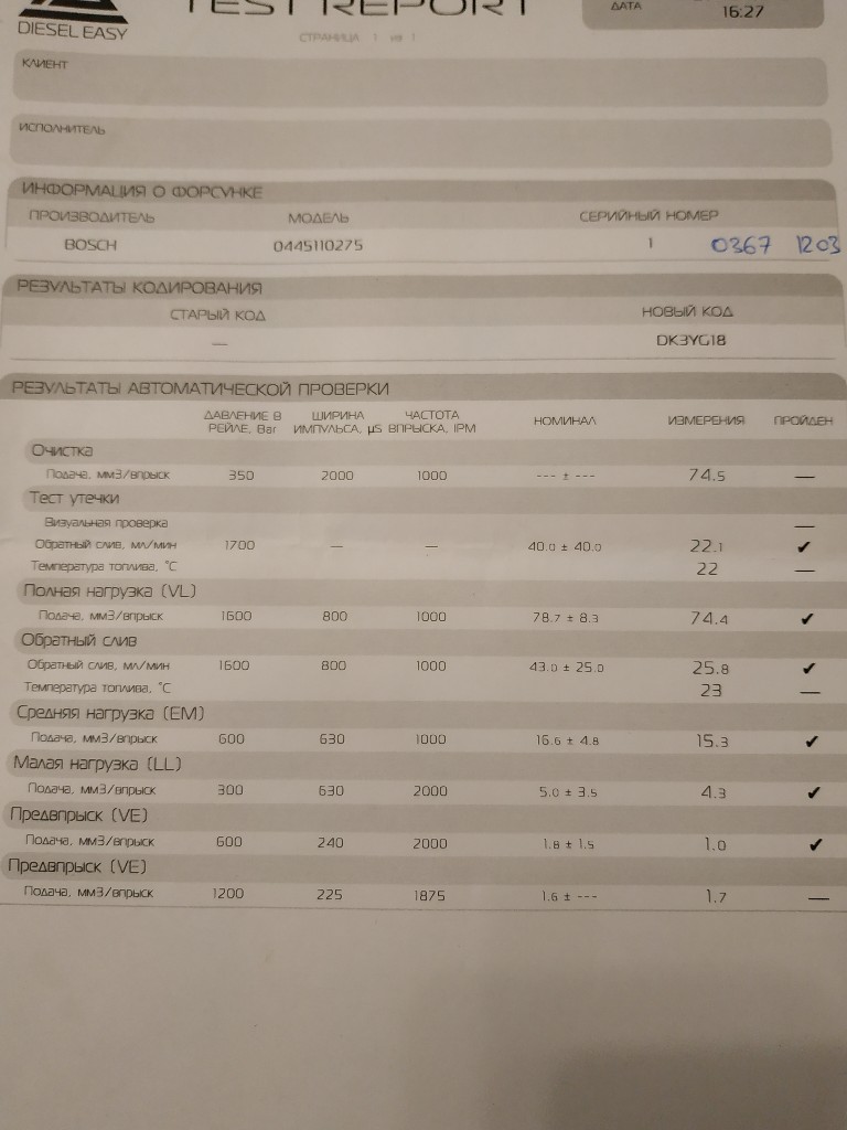 В тест репорте, после проверки форсунки на стенде