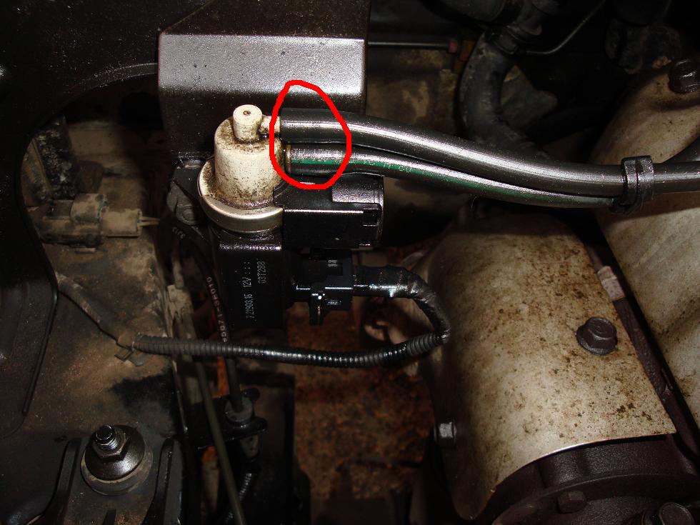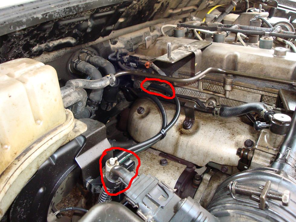 Красным выделил места протечки масла. В верхнем правом углу красным выделены трубки. Верхнюю вообще сорвало.
