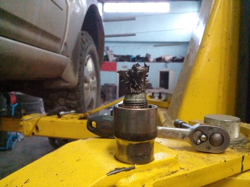 первая замена масла на 400км(на самом деле фото уже когда снимали блокировку, при замене масла не сфотографировал пробку, но было так же):