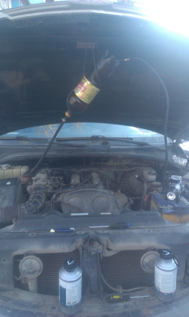 с другой стороны ко дну бутылки к соску прикручиваем компрессор.и накачиваем бутылку до 3х атмосфер у меня было где то 3.4.делаем это для того что бы увидеть все ли соединения плотные и нигде ли не сочиться воздух так как давление в бутылке должно быть что бы жидкость уходила как надо(так как в рампе тоже есть давление)если же бутылка надулась и держит компрессию значит все в норме.Стравливайте давление с помощью откручивания насоса откручивайте крышку и заливайте жидкость(так как 1 бутыль рассчитана на объем двигателя 2000,а у меня 2.4 я налил жидкости где то 1300 там на упаковке все написано не ошибетесь.Далее бутыль подвешиваем и заводимся машина должна у вас работать только на жидкости,не включите случаем насос а то бензин потечет,так вот машина заведена на жидкости и работает 10-15 минут,затем глушим и пусть все отмокает 15 минут,затем опять заводимся и в течении 10 минут или до окончания жидкости делайте обороты плавными от 1000-2500 и обратно!потом все шланги на место,предохранители и тд спокойно заводитесь и едете!Фильтр топливный нужен ОБЯЗАТЕЛЬНО без него ничего не получиться!Ах да соки нужны один с нипелем((для насоса) второй который в крышке без нипеля что бы жидкость спокойно бежала!!