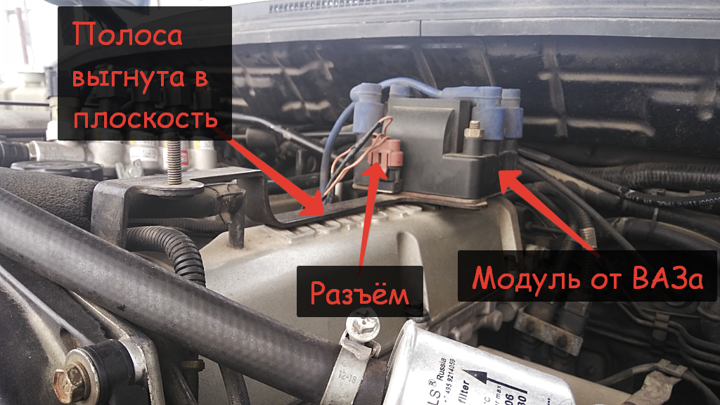 В принципе, модуль может стоять где угодно, может даже и не на двигателе, лишь бы проводов до свечей хватило. И он не любит адской жары. На выпускной коллектор не прикручивать!