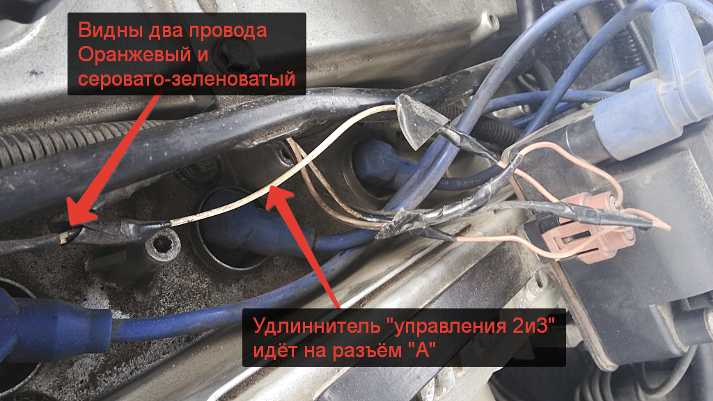 «A» соединяем с проводом управления катушки 2-го и 3-го цилиндров (оранжевый и некий серый, в моём случае),