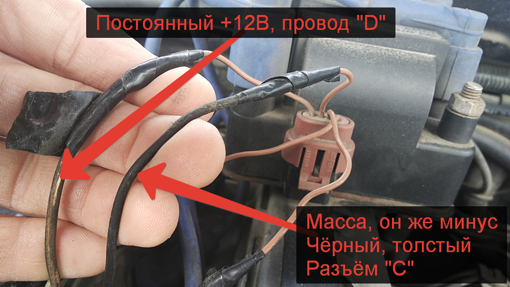 «D» +12В - то есть постоянный Плюс, который приходит туда с включением зажигания и питает модуль зажигания. Опять же можно скрутить полосатые толстые провода с обоих старых катушек и прикрутить (припаять) к проводу "D". Или один заизолировать и как-то аккуратно убрать в гофру.