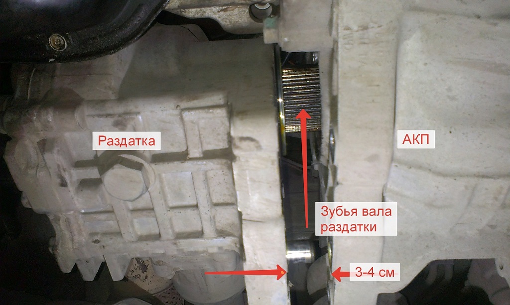 Очередная лапша, ну детский сад кокой-то, через какую там щель можно увидеть шлицы вала раздатки и диффа коробки? Там уплотнительное кольцо стоит, и пока не раздвинешь раздатку от коробки ничего не увидишь, смотри фото.