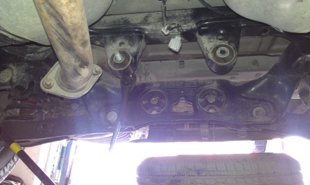 Выезжал на природу, ездил по гравийке 10 км. Не заметил камень на дороге, налетел защитой двигателя немного, пару вмятин на выхлопной трубе и поцарапал нижний рычаг слева задней оси.