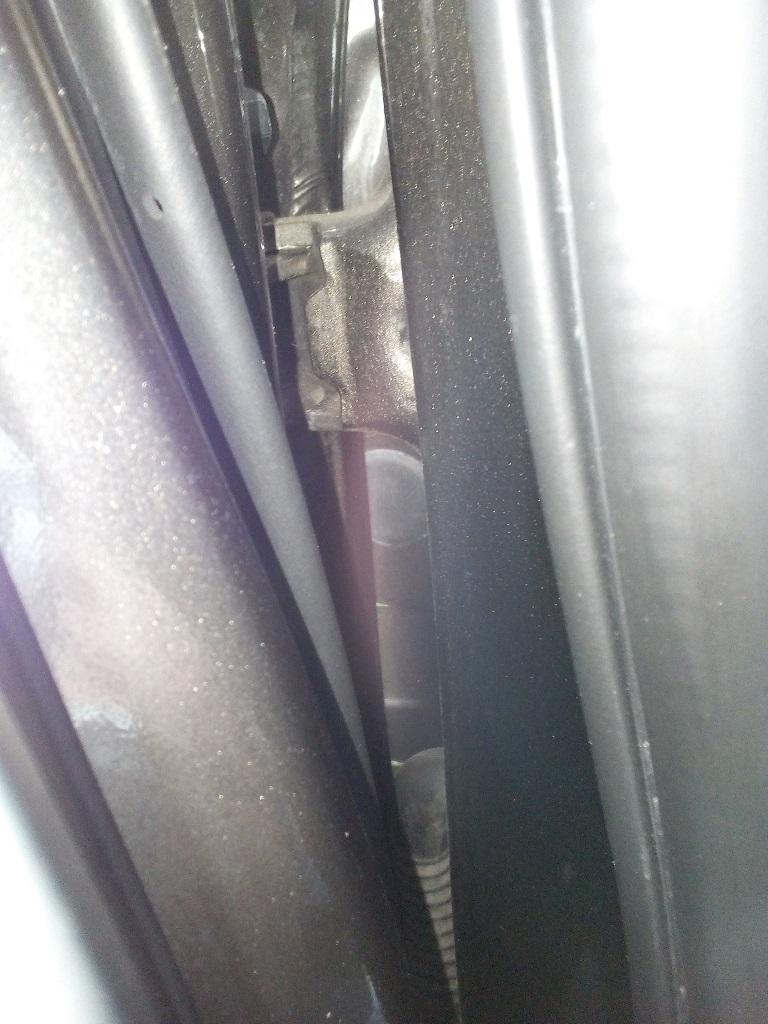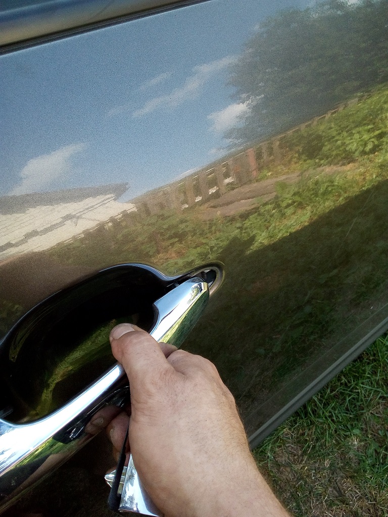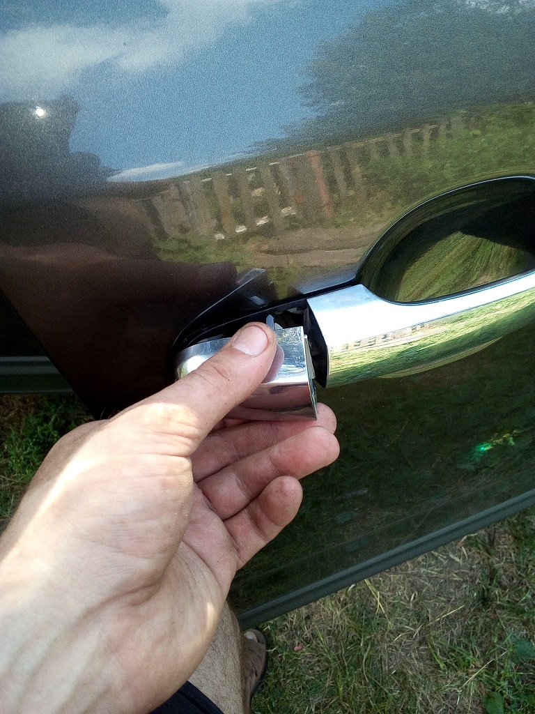 Открываем заднюю дверь наполовину и видим в проеме между передней и задней дверью заглушку крепления внешней ручки передней двери