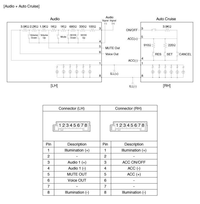И может у кого есть таблица сопротивлений для магнитолы? Тогда я бы еще и кнопки круиза подключил к магнитоле на какую-нибудь функцию, чтобы просто так не торчали :)