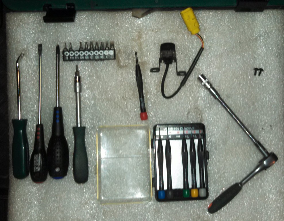Вообще этот колхоз уже порядком надоел. Процесс разборки примитивный, но требует кучу инструмента и прямых рук. Того и гляди, что-то сломаешь, поцарапаешь, погнешь. На всякий случай, если кто-то будет заморачиваться, то привожу фото требуемых инструментов (хотя качество г...., руки после монтажа тряслись от негодования).