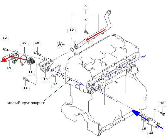 Cons писал(а):При том что термостат выпускает горячую ОЖ из блока двигателя, а не впускает туда холодную из радиатора, и выпускает ее в нижний патрубок. Термостат деталь 11, выпускает в патрубок 14 или в точку (В) на другом рисунке.