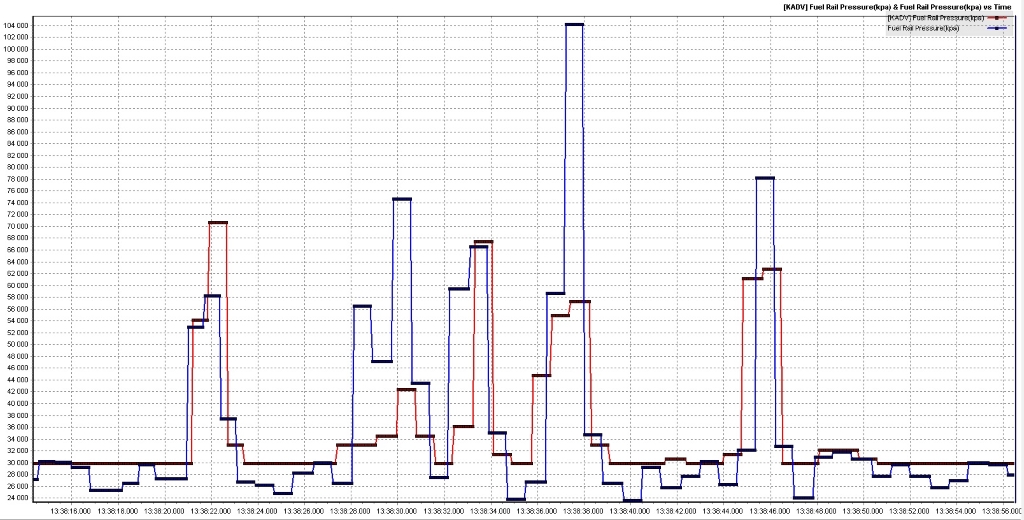 Есть сомнения по правильности работы регулятора давления в топливной рейке, выкладываю свой лог. Синим фактическое значение, а красным задание.