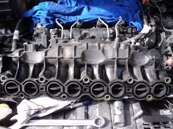 Далее вернул на место держатель (раму –сам так назвал) РВ, установил РВ и крышки подшипников РВ. А вот здесь внимание! При установке РВ смотри метки на шестернях РВ – одна спереди , а другая сзади (см. фото). Одна из шестернёй разделена на две части и она подпружинена и тем самым при установке РВ нужно их совместить с обеих сторон. Далее 20 болтов вернул на место (момент затяжки – 10.8-12.7 Н.м). После установил гидронатяжители (затяжка – 9.8-11.8 нм), успокоители, шестерню КВ, нижнюю цепь вместе с шестернёй ТНВД (момент затяжки гайки – 78.5-93.2 нм), далее верхнюю цепь и успокоитель верхний при этом всё строго по меткам. Снял чеки с гидронатяжителей. Прокрутил КВ несколько раз на 360гр. и убедился в совпадении всех меток. Далее установил крышку ГРМ (места нанесения герметика видны по старому герметику) тюбика хватит на всё (затяжка – см. фото). Далее установил шкив КВ (затяжка болта – 196.1нм + довернуть на 60 гр.), клапанную крышку (затяжка первый подход – 3.9-5.9нм и второй подход 8.8-10.8 нм. порядок затяжки – см. фото). При установке клапанной крышки в местах соприкосновениях с крышкой ГРМ и блоком, местах соприкосновения клапанной крышки с вакуумным насосом, внизу также в местах соприкосновения крышки ГРМ и с верхним масляным поддоном – нанести герметик, но аккуратно. Впускной коллектор (затяжка – 19.6-23.5нм). При установке форсунок обязательно обратить внимание на грязь в колодцах, должно быть очень чисто (затяжка форсунок – 32.6-41.3н.м), если попадёт грязь между медным кольцом форсунки и блоком – то как следствие может не запуститься движок.