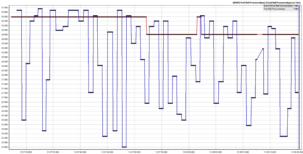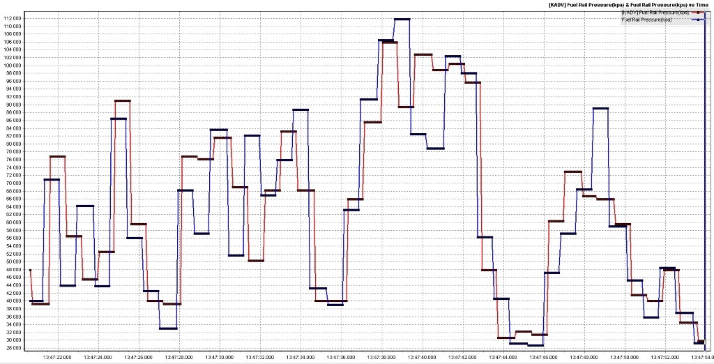 Есть сомнения по правильности работы регулятора давления в топливной рейке, выкладываю свой лог. Синим фактическое значение, а красным задание.