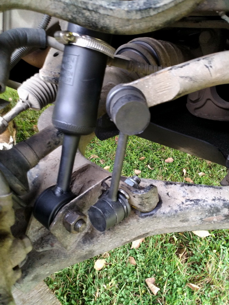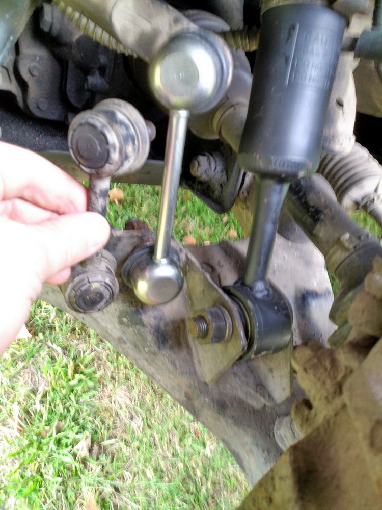 На перед основная проблема на в длине линка, а в изменении угла кронштейна на нижнем рычаге к оси линка. Палец стоит не в середине посадочного места, а отгибается вверх. Поставив удлиненный линк мы сам стабилизатор вернем в исходное, но за счет ненормального угла шарнир быдет выходить из строя быстрее.