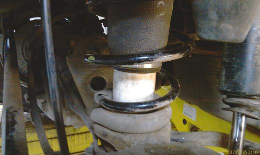 Верхняя часть проставки хорошо села в отверстие верхнего упора пружины. Нижняя часть проставки также подошла по диаметру низа пружины . Чтобы не гуляла нижняя проставка, был установлен кусочек трубы 30-50мм и закреплен болтом на нижней площадке упора пружины на мосту. Все проставки были прикрчены и приклеены к корпусу баллона на болты.