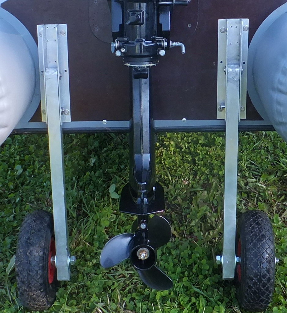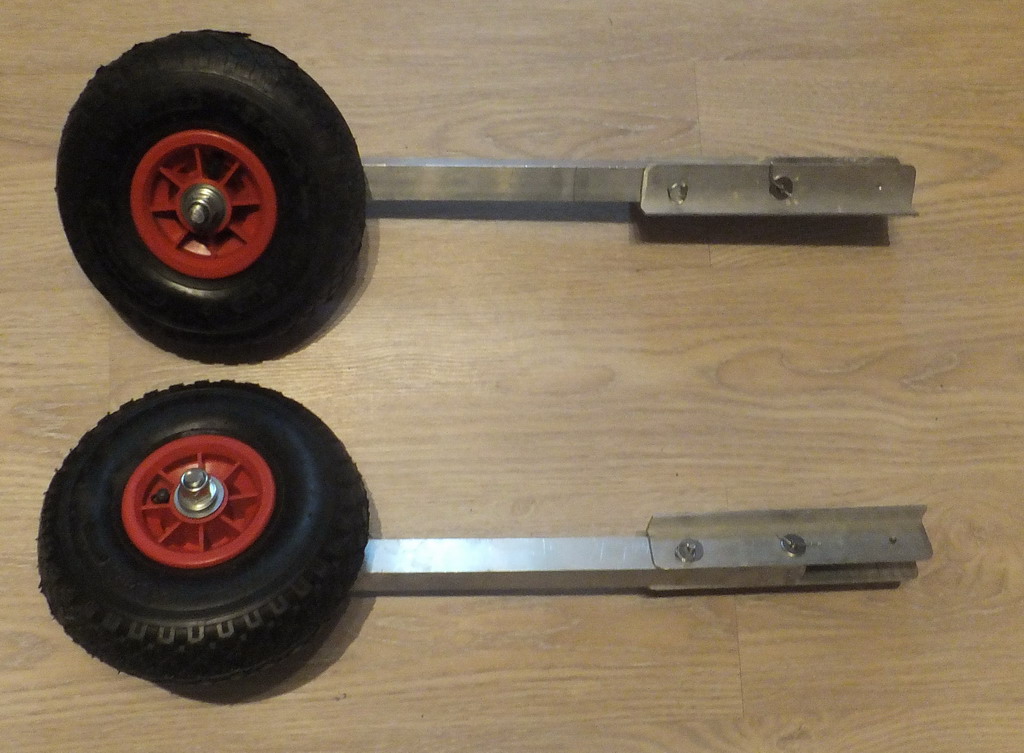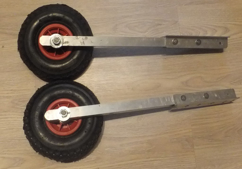 Дальше – ноги…Надувные колеса на подшипниках, но с пластиковым ободом - 260 руб за штуку. Внутренний диаметр 16 мм – соответственно шпилька, гайки шайбы. Отрезал от трубы два куска по 500 мм. Для прочности залил внутрь монтажную пену. Оба конца трубы скруглил и на 5-6 см забил холодной сварки. Просверлил отверстия под колеса, ну и накрутил их (шпилька, две гайки у трубы и законтрил нераскурчивающейся гайкой колесо. В стойке и ее держателе просверлил по три отверстия. Центральное для крепления стойки, два других для фиксации стойки в верхнем и нижнем положении. Держатель планировалось крепить к транцу, а вот стойки сделать съемными – чтобы не мешали укладке надувной лодки. Но проблема в том, что идеально подошли бы такелажные пальцы с откидывающимся флажком, но….. не нашел. Через две недели пообещали привезти, но отпуск начинался через два дня… Поэтому закупил нержавеющие пальцы с отверстием под шплинт.