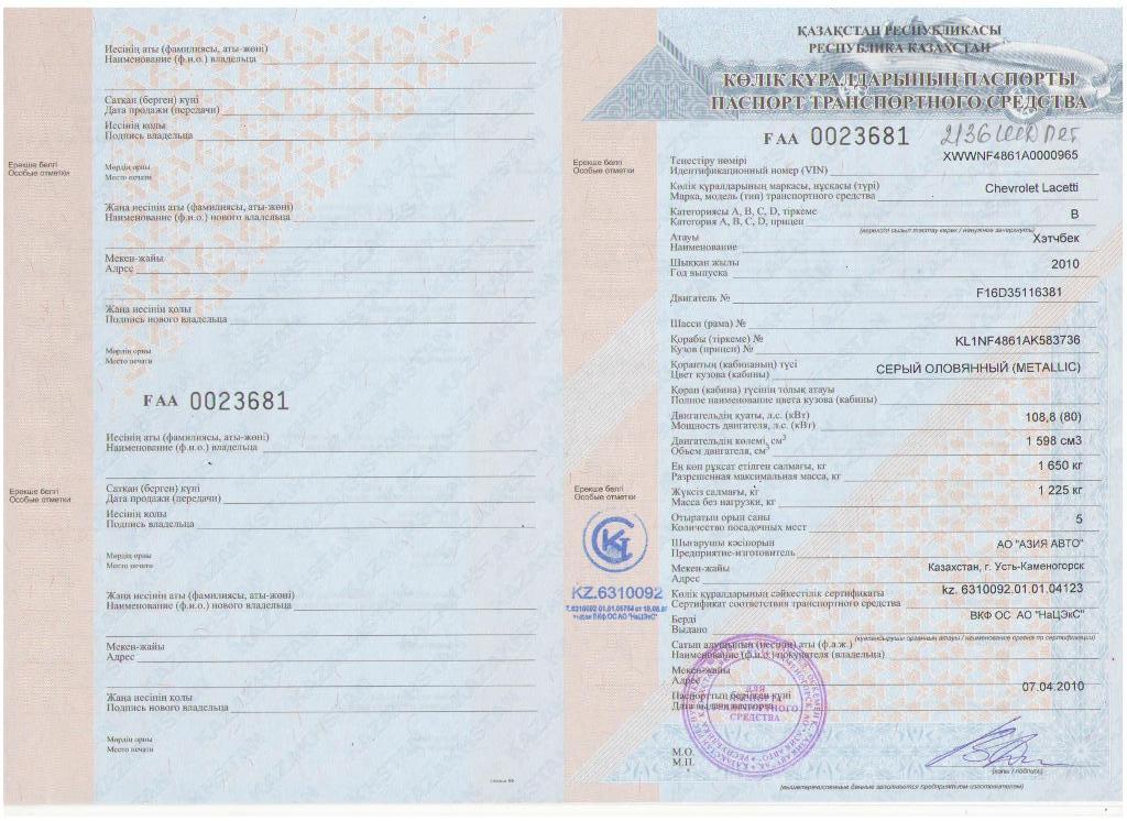 в строке "сертификат соответствия транспортного средства" - kz.6310092.01.01.04123