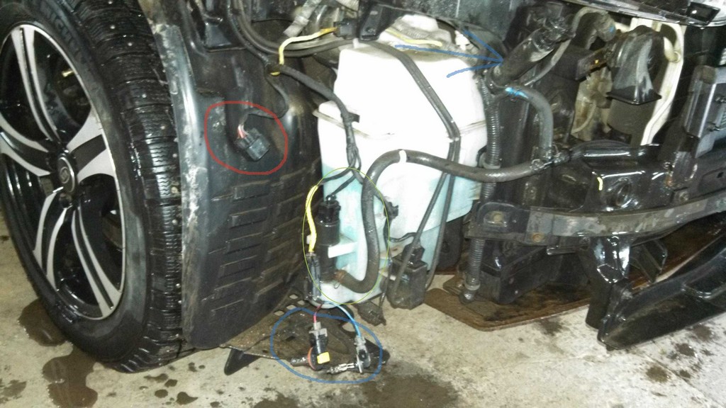 Получается здесь: зеленым - тот злой насос, который отказывается работать. красным кружком - разъем датчиков, синим кружком - разъем фар, стрелкой сам омыватель.