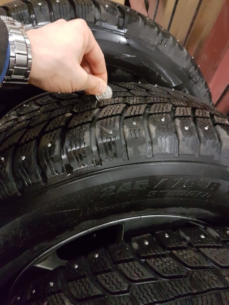 Состояние отличное. 75% толщины протектора и 65 - 100% шипов в зависимости от колеса.