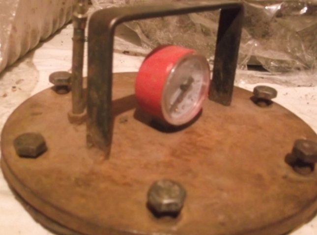 Сверху в крышке просверлено два отверстия: в одно вкручен манометр, в другое сосок с колеса автомобильного с золотником. Прежде чем ставить на газ рекомендуется 1 атм накачать насосом(особенно для карасей). Но не обязательно.