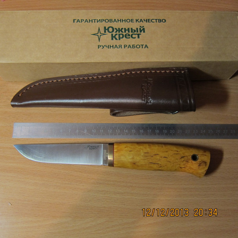 Клинок Д2, тройной клин. Спуски прямые, примерно в 0,2. Бреет из коробки. Длина клинка 120 мм, толщина клина у больстера 3 мм, сужение на клин к кончику. Рукоять-карелка с традиционной многослойной пропиткой от ЮК, латунная темлячная трубка. Ножны в комплекте со свободным подвесом-традиционно аккуратные, нож входит с натягом и уверенно в них держится. Коробка, сертификат, минт.
