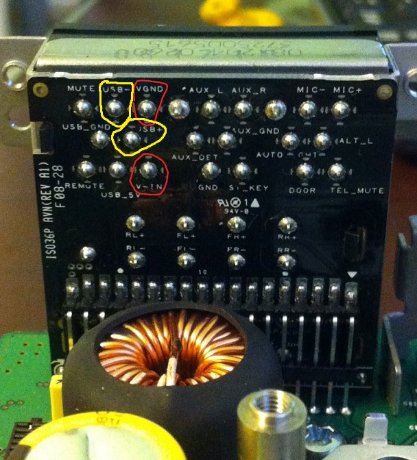 - Теперь камера. Поставил я китайскую камеру 12 В, NTSC. Питание взял от фонаря заднего хода, 12В подал на контакт "Reverse" - магнитола врубает черный экран с надписью чтоб убедился в безопасности маневра. А вот изображение камеры на экране выглядит будто негатив (как проявленная пленка) и вдобавок скачет во все стороны и двоится/троится. Думал, что проблемка в самой камере. Купил другую, воткнул - история такая же. Кинул новый провод напрямую - ничего не поменялось. Видеосигнал с тюльпана подал на контакты USB+ и USB- (прикладываю картинку, на ней обозначил желтыми кружками). Такое ощущение, что видеокабель камеры не туда приколхозил (точнее наверное "+" туда куда надо, а минус не туда).