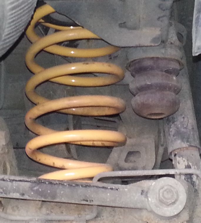 От поперечной тяги зависит, но не в том смысле, что из-за лифта мост ушел в сторону, потому и трется. При разжатии пружин мост уходит влево, это на руку правой пружине (уводит ее от отбойника), и не существенно для левой пружины, т.к. там место соприкосновения близко к нижней опоре пружины, которое движется вместе с мостом. А вот при сжатии картина такая: нижний большой виток левой пружины неминуемо садится на наклонную стенку опоры продольной тяги, т.к. она к основанию шире и ближе к опоре пружины (на верхнем фото видно), а с правой стороны (нижнее фото) - третий и второй снизу из больших витков чиркают о чашку отбойника, а на нижний виток, из-за сдвига моста тягой вправо при сжатии пружины, чашка прямо садится. Это правда положение когда мост уже на отбойниках. Это попробую сфотографировать еще при случае.