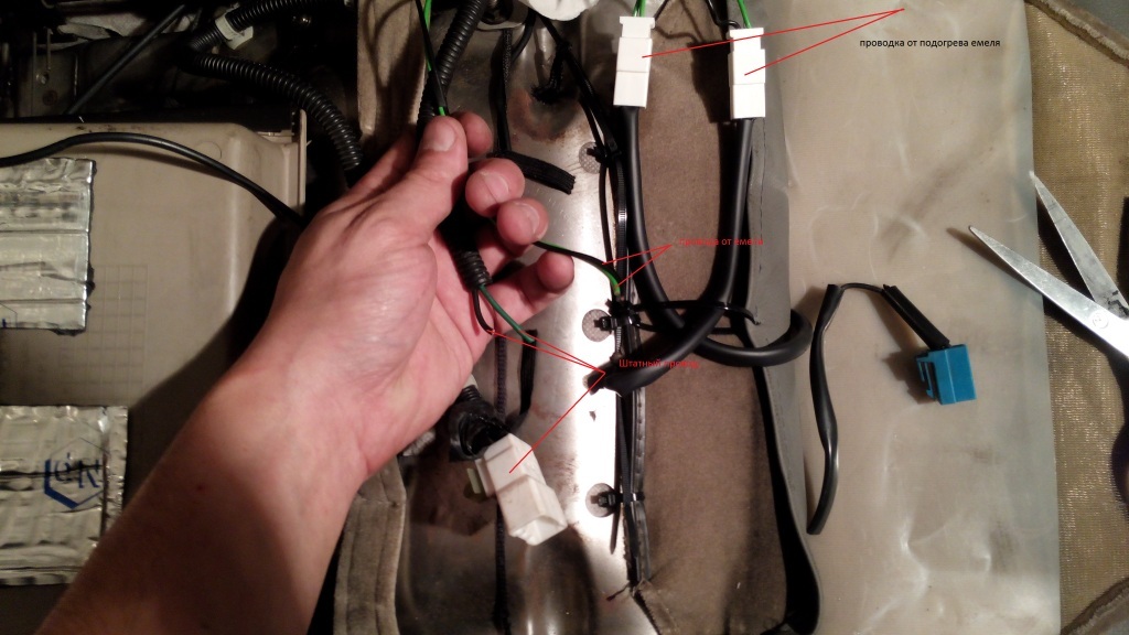 немного фото по установки емели. Потребуется : Головка на 14 и 12, кусачки, пластиковые хамуты, двойной скочь , ножницы, термо-усадочные трубки. Снимаем сидения, обшивку сидения разбираем аккуратно с помощью кусачек, откусывая кольца. После снятия чехла удаляем старую проводку, оставляем только разъём "маму" на сидении и часть провода до колодки соединения со спинкой. Устанавливаем полотно от емели так что бы прорезь под соединения с чехлом не попадала на провод нагрева (см. фото) вдеваем хомуты ( тут может понадобится пинцет) в сидения и соединяем с чехлом последовательно, лишнее откусываем. От проводки емели отрезаем колодки соединения с нагревателями с черным и зелёным проводом и соединяем с " мамой" от штатного подогрева. ставим на место и наслаждаемся теплом.