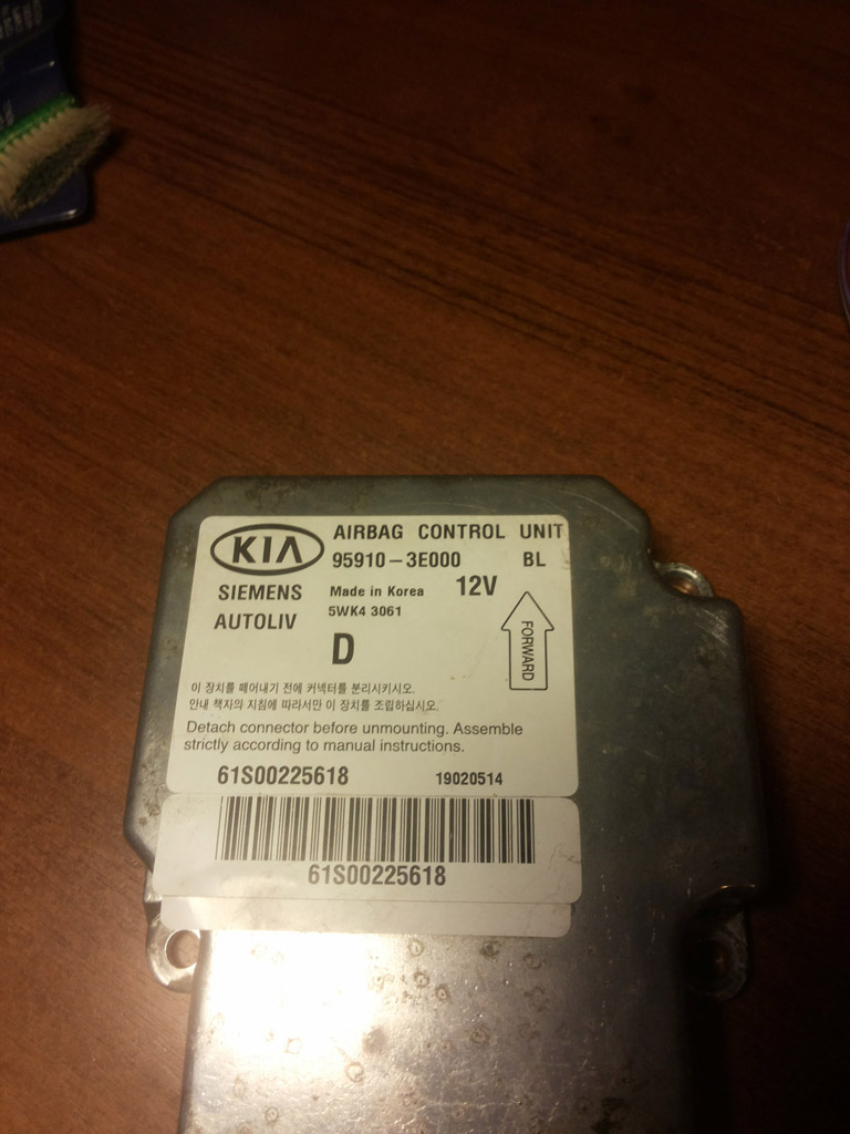 На машинах 2002 - 2004г.в. могут стоять два разных блока. Блок с номером 95910-3E000 идет для 1-й подушки (в руле водителя), блок с номером 95910-3E100 для 2-х подушек (в руле водителя и пассажира). Блоки по внутреннему "железу" одинаковые, разница в прошивке. Разбираем блок открутив четыре винта под пятиконечную звездочку, со штырем по центру (такие же как на расходомере). На плате находим небольшую микросхему памяти (имеет 8 выводов с маркировкой 95080) Для наглядности я обвел ее красным.