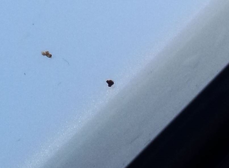 Такая же история. Моя машина белого цвета, спустя месяц после покупки заметил, что ржавеет крыша над лобовым стеклом, четыре точки. Краска как будто проткнута иголкой и от туда растекается ржавчина сверху по краске. Вспомнил, что здесь или на другом форуме, кто-то уайт спиритом протирал такой жучок и становилось не так заметно. Потёр пальцем - потёки ржавчины исчезли и стало как на фото.