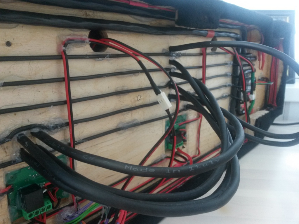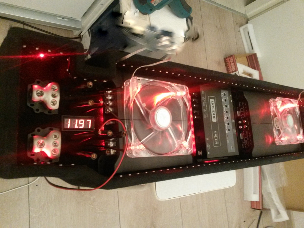 Компоненты(с лева на право): распределители питания, вольтметр, усилитель DLS XM20(+вентилятор 140 мм), электронный термостат(для включения вентилятора DLS XM 20), аудио процессор Audison bit ten, электронный термостат(для включения вентилятора DLS XM 40), усилитель DLS XM40(+вентилятор 140 мм), клемная колодка.