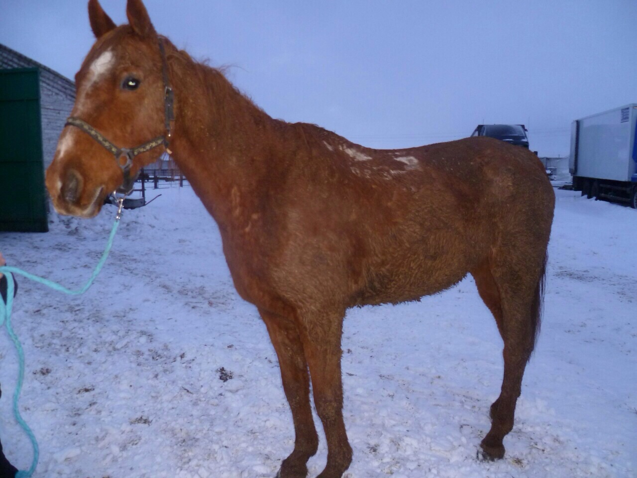 Взял я его на бойне, через пару дней он должен был стать колбасой. Увидел и мне так жалко его стало.. Сытые домашние кони и так хорошо живут, а этому по ходу досталось здорово: худой, спина сбита до мяса плохим седлом, шея порвана, на ноге здоровая рана, сустав опухший, а глаза такие добрые-добрые! Ценник мне зарядили 150 руб за кило живого веса, при том что конина считается дешевым мясом, и в итоге цена получилась почти в ровень с нормальными конями, но решение было принято и отступать я не собирался. Купили коня, привезли, помыли- почистили, полечили, раны зажили, шерсть наросла, пищеварение поправили, копыта в порядок привели, даже паспорт его в НИИ коневодства восстановили. Сейчас конь находится в активном тренинге с опытным берейтором, который учит коня правильно реагировать на команды всадника и накачивает коню мускулатуру, чтоб подо мной не кряхтел :) ветеринар с середины февраля ежедневно осматривает, обрабатывает, лечит. К концу мая планирую достроить конюшню и перевезти его к себе. Кстати, он оказался не буденовской, а Донской породы, что в принципе одно и то же :)