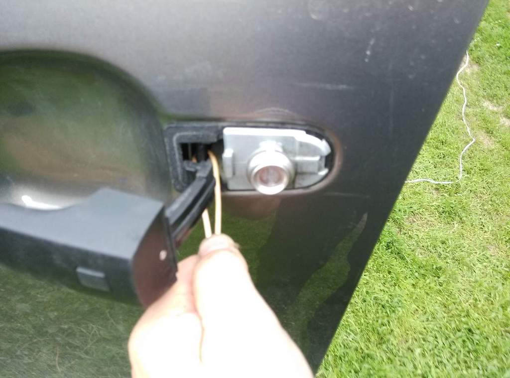 Далее используя веревку или как я — проволоку, нужно зацепить язычок открывания двери — потянуть его на себя и только после этого вставлять туда ручку.