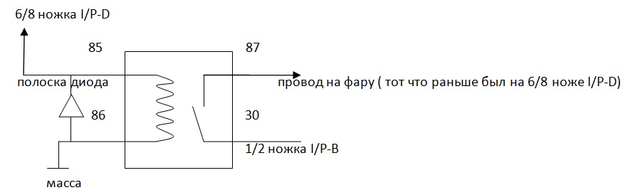 Понадобится 2 реле, клемы, два диода (из любых выпрямителей, блоков питания - черные боченки с белой полоской с одного края). Одно собирается с проводом от 1-й ножки I/P-B и 6-й ножкой I/P-D, второе с проводом от 2-й ножки I/P-B и 8-й ножкой I/P-D. Диод припаивается белой полской к +12, вторым концом к массе (-).