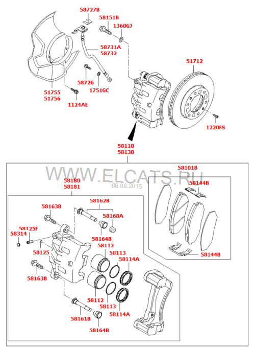 Прикладываю схему. Тут даже видно, что сверху втулка есть, а снизу нет. Суппорт расположен позади диска.