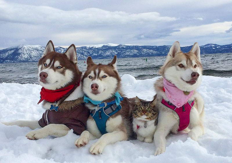 "В Калифорнии бездетная хаски спасла беспомощного больного котенка, и теперь малыш является полноправным членом собачьей стаи."
