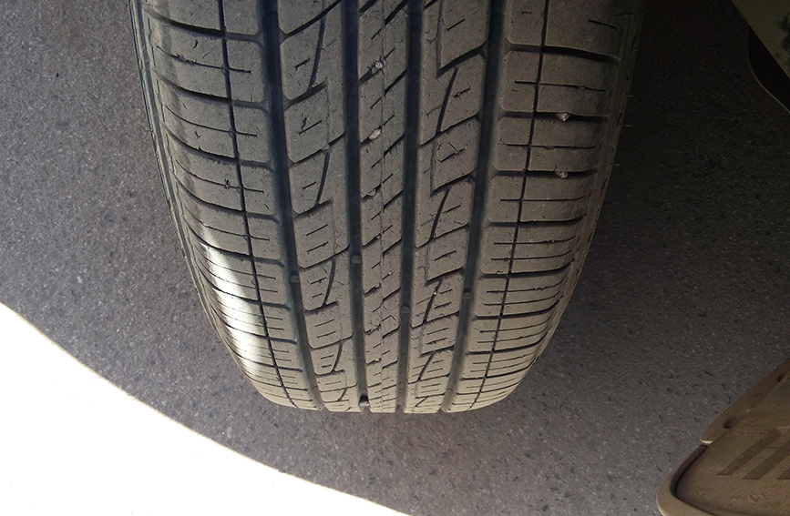 Не буду голословным, вот сейчас сфоткал. Еще заметен провал в центре протектора.