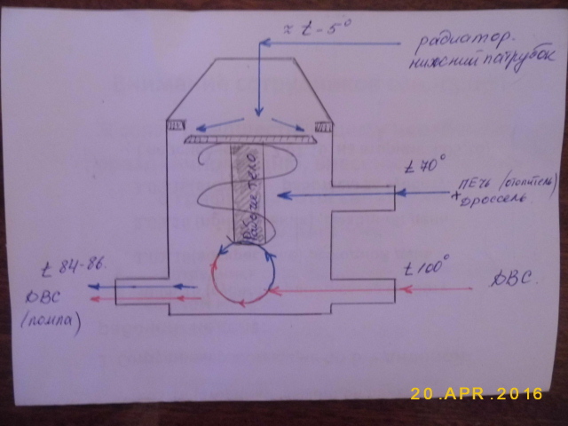 допустим на улице ноль , радиатор при обдуве охлаждает жижу примерно до -5 , печка работает и остужает жижу тоже . как видишь обратка бьет прямо на тело термостата, а потоки смешиваются ниже . Температура в движке растет , а термос все еще не работает, потому что печка еще холодная . вот винты и работают.